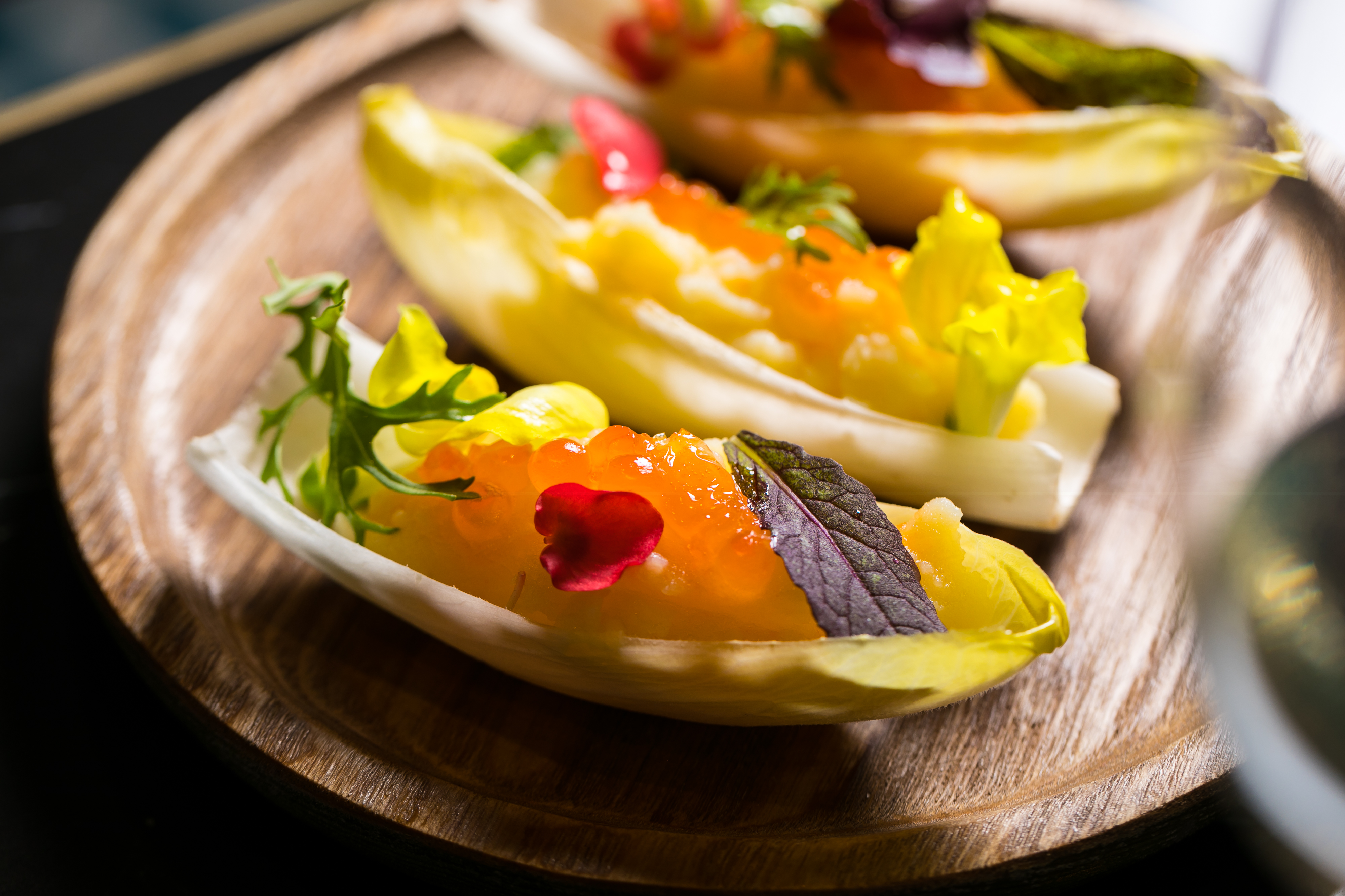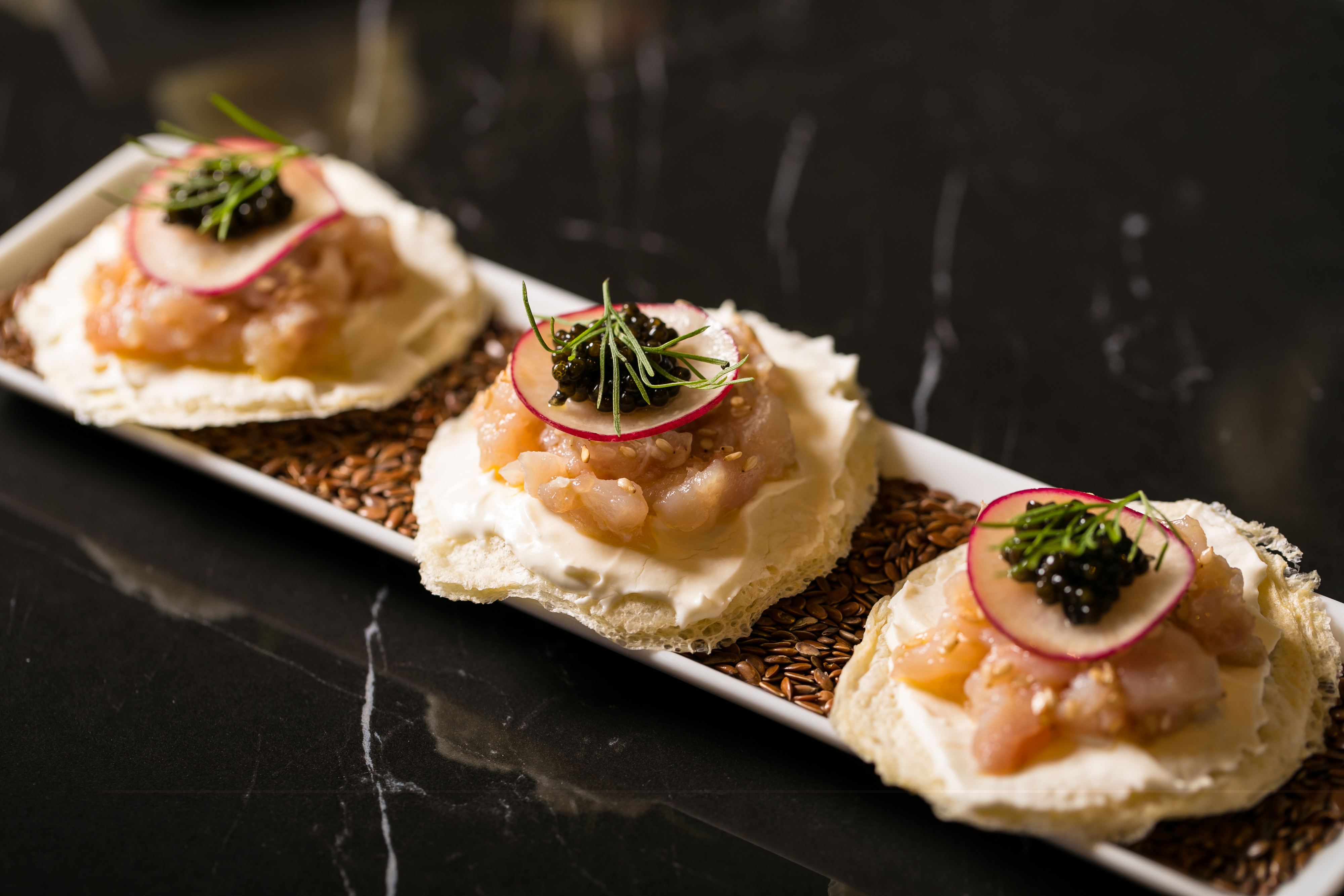 Sfiziose le tapas a base di uova di pesce che vedono in menu 10 gr di caviale con Blinis e Panna Acida, un Crostino Integrale, Burro e Bottarga di Tonno, un Mini Panino, Salmone Affumicato e le sue Uova, la Tigella, Ricciola e Caviale, la Polenta Soffiata con Mantecato di Baccalà e Tobiko, la Schiacciata di Patate, Misticanza e Uova di Trota.